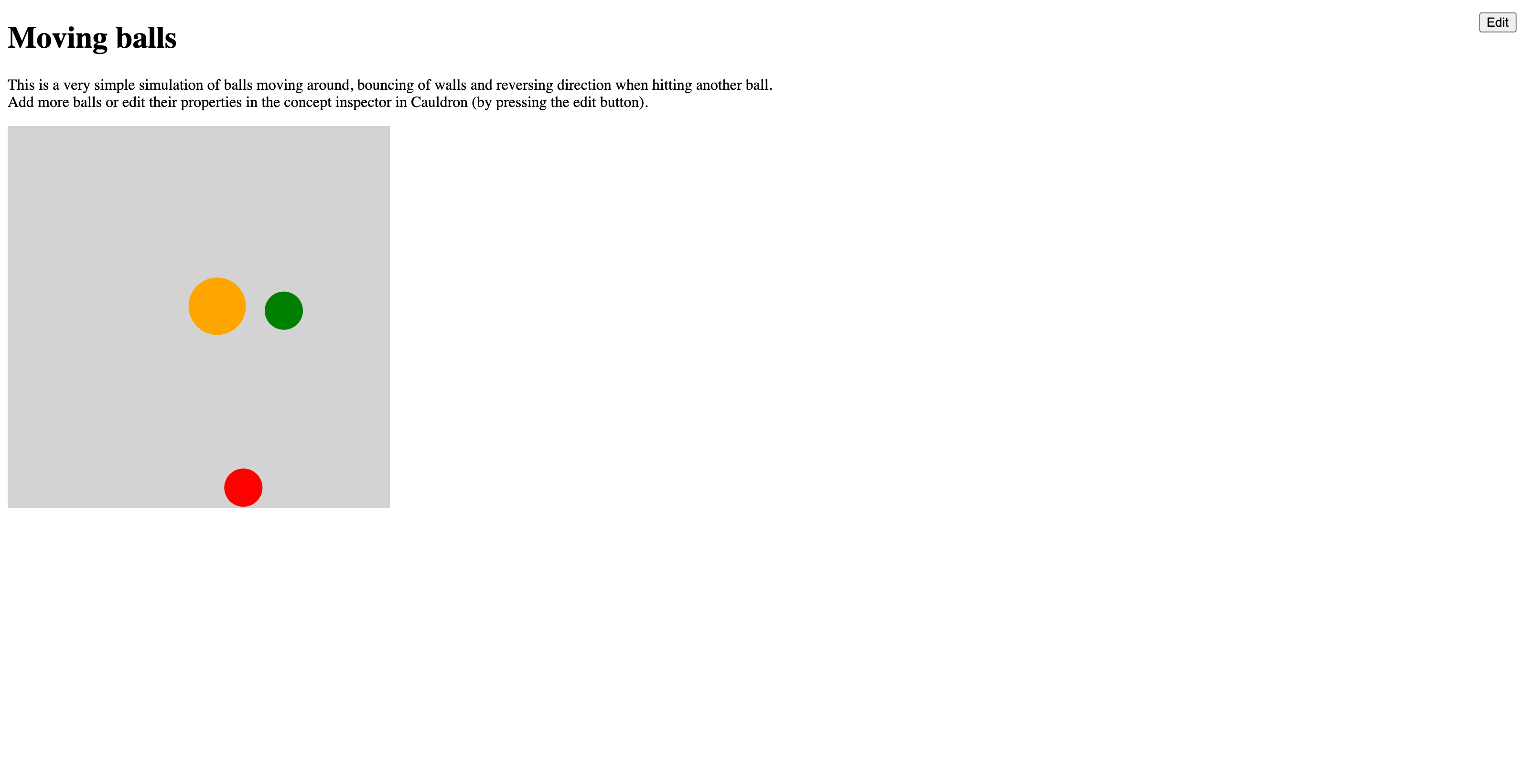The moving balls demo is a simulation of balls bouncing around a box. The demo illustrates Varv’s ability to add custom logic and properties directly to concepts.