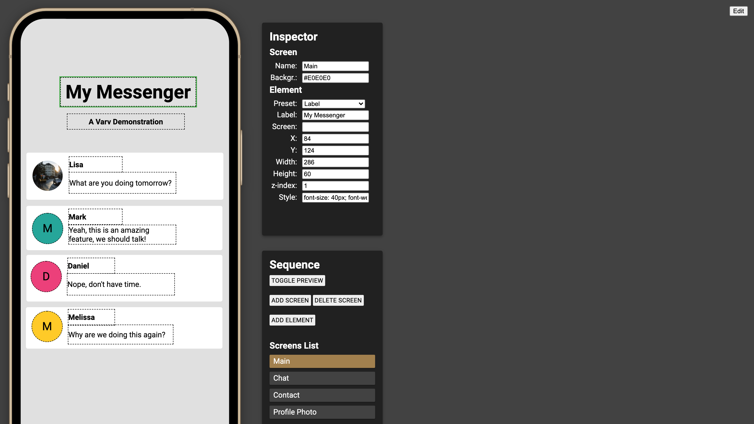 The UI designer is a collaborative tool for designing and prototyping user interfaces and navigation of apps, similar to features found in Figma. The UI designer showcases Varv’s ability to create applications that contain user provided content. In addition the UI designer uses several common strategies for organizing larger Varv applications, such as: